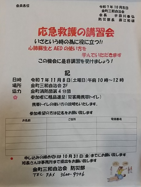 応急救護の講習会 11月08日(土)10:00~12:00 自治会会館 参加申し込みをしてください。電話でも受け付けます。 10月31日まで