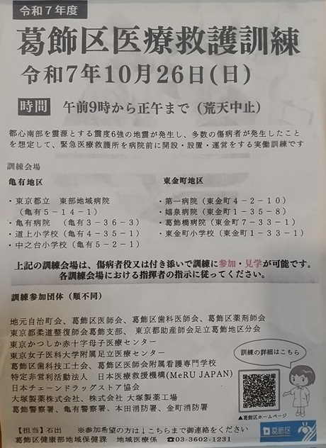 葛飾区医療救護訓練 10月26日(日)9:00~12:00 場所は区内数か所 案内書 見学など申し込みをしてください。